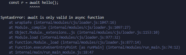 다음은(2)부분을 보면callHello()메소드에도async가 추가됐다. await키워드는async키워드가 붙은 메소드에서만 사용할 수 있다. 만약async가 없는 메소드에서await를 사용한다면 아래와 같은SyntaxError가 발생한다.