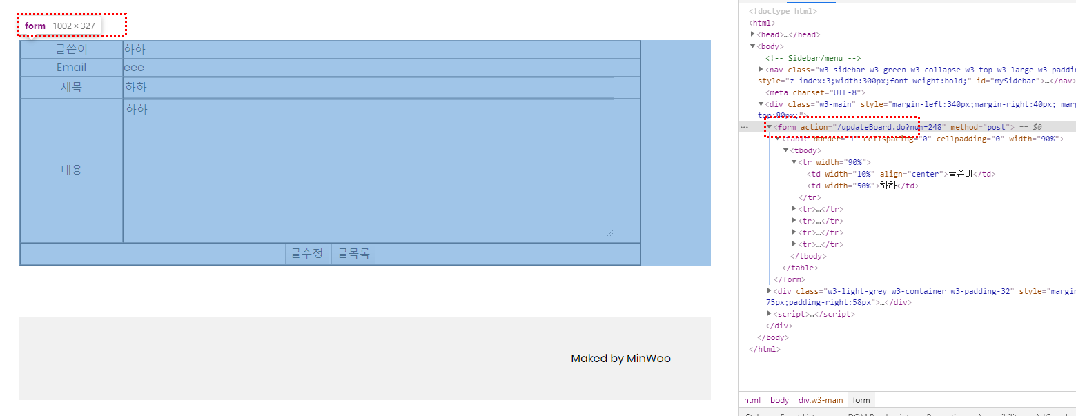 아래 테이블 코드가 있습니다. 글쓴이 ${board.writer} Email ${board.email} 제목 내용 ${board.content} 그리고 아래가 그 테이블입니다. form이 차지하는 영역을 봅시다. 아래와 같습니다. 테이블을 봅시다 w..